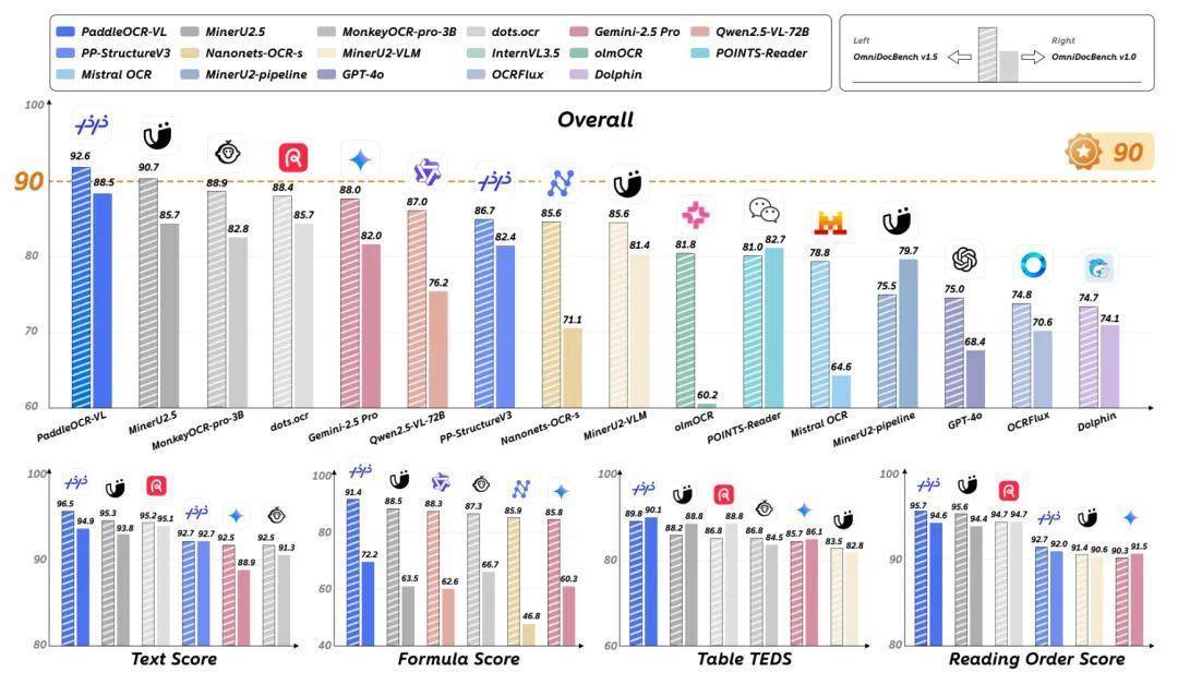 在最新一期OmniDocBench V1.5榜单中,PaddleOCR-VL以92.6的综合得分问鼎榜首。