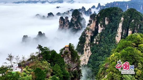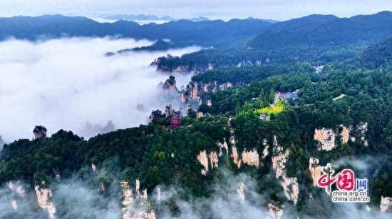 漫步张家界国家森林公园,天子山、袁家界、黄石寨等景区同步“上演”绝美云海景观,云雾如白色绸缎在峰林间流转,时而将群峰包裹成“海中岛屿”,时而退去展露峰林全貌。游客们静静欣赏着大自然的鬼斧神工,从各个角度拍摄奇峰云海的绝美瞬间。