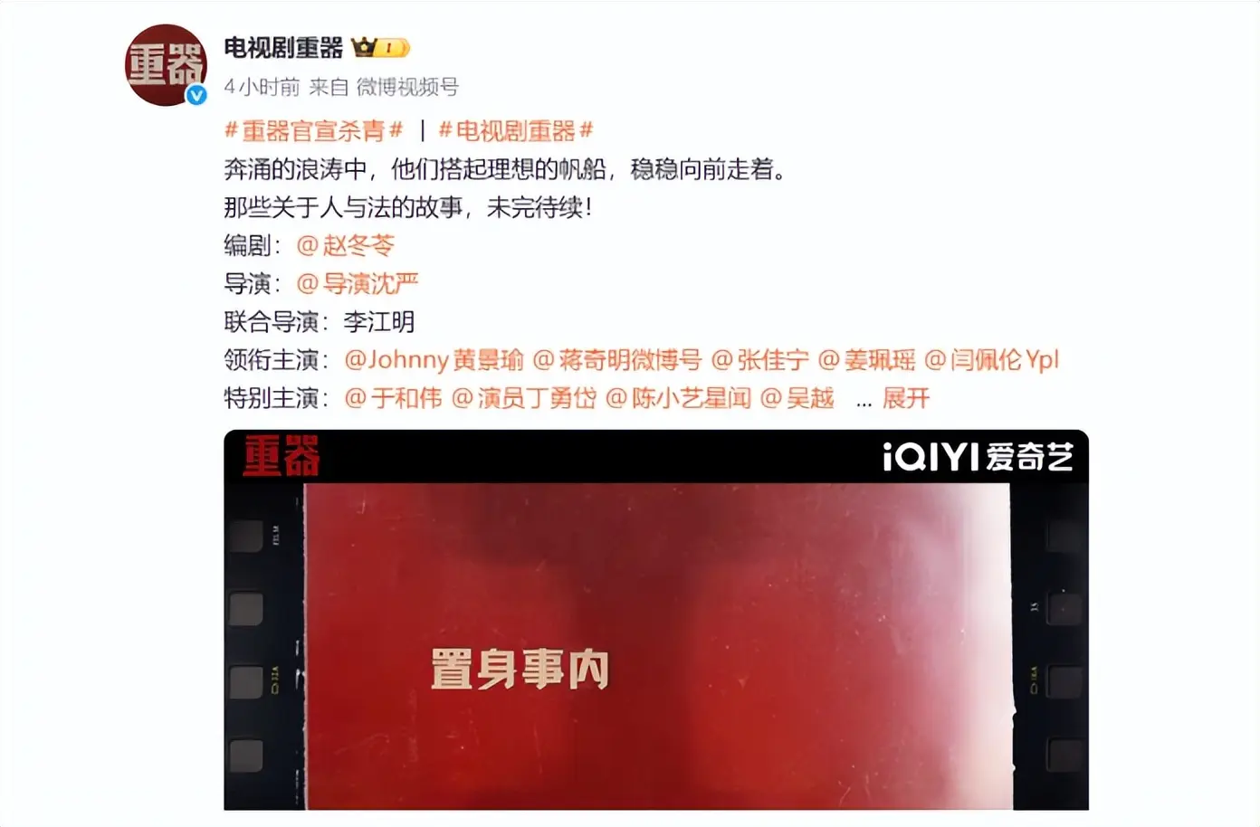 《重器》由最高检出品、于和伟、吴越等领衔主演,目前已经官宣杀青,相信不久就要和我们见面了!