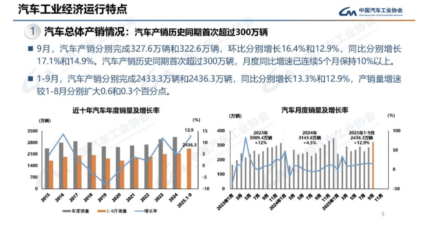 10月14日,中国汽车工业协会发布数据显示,今年9月我国汽车产销分别完成327.6万辆和322.6万辆,环比分别增长16.4%和12.9%,同比分别增长17.1%和14.9%。汽车产销历史同期首次超过300万辆,月度同比增速已连续5个月保持10%以上。